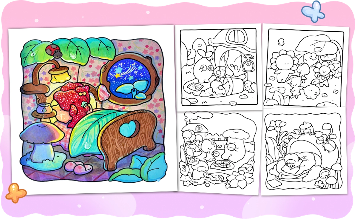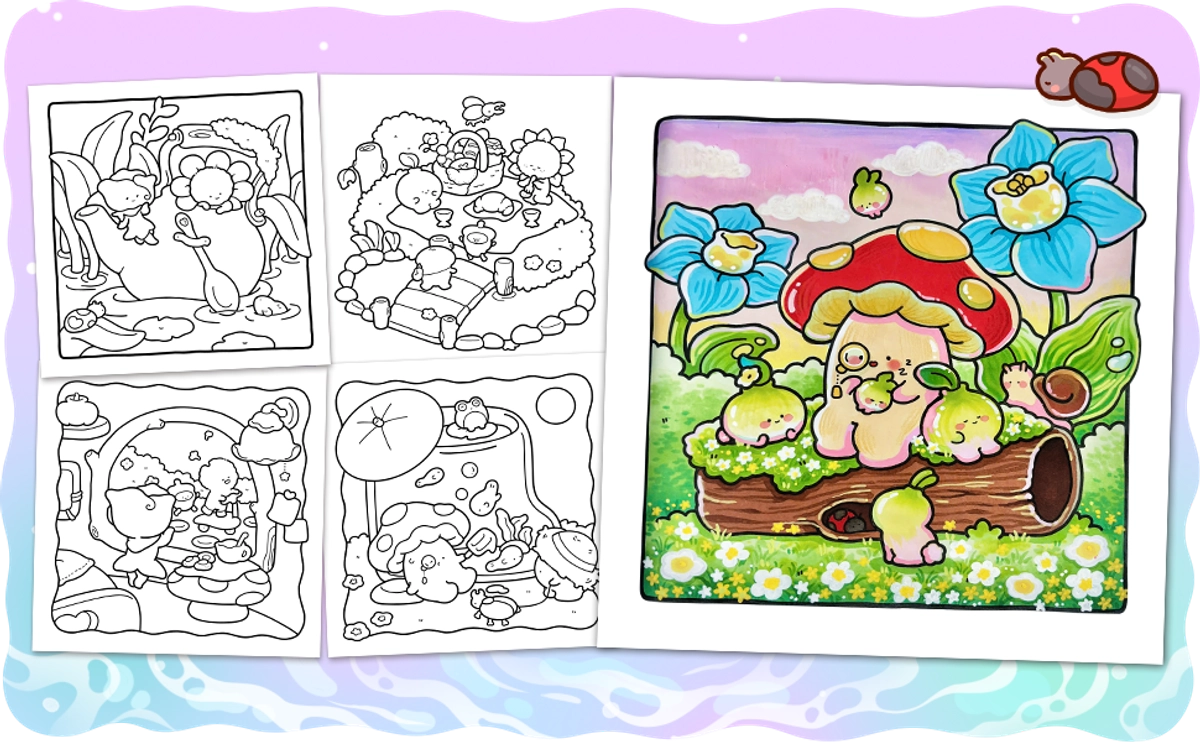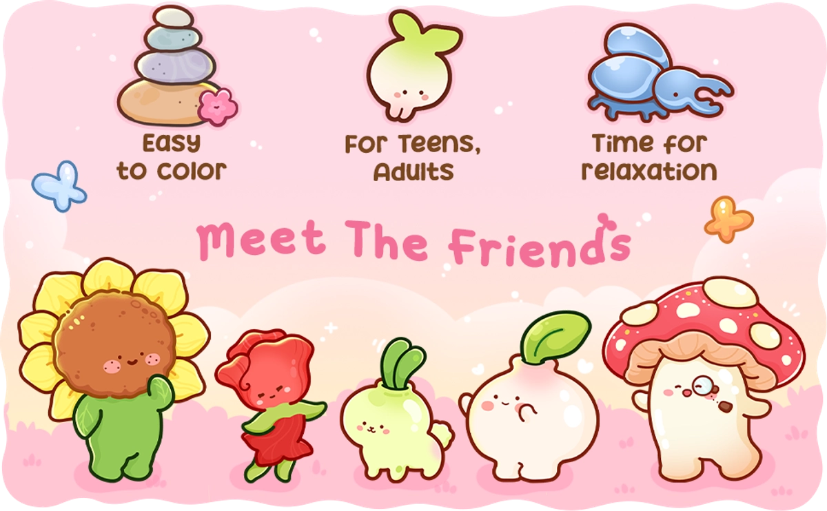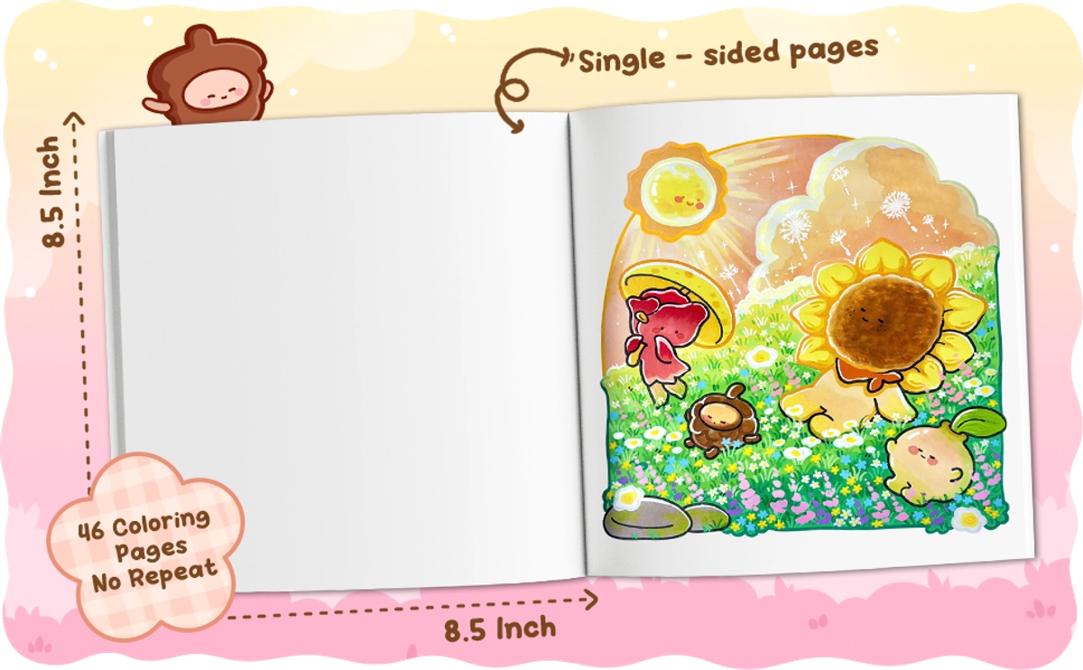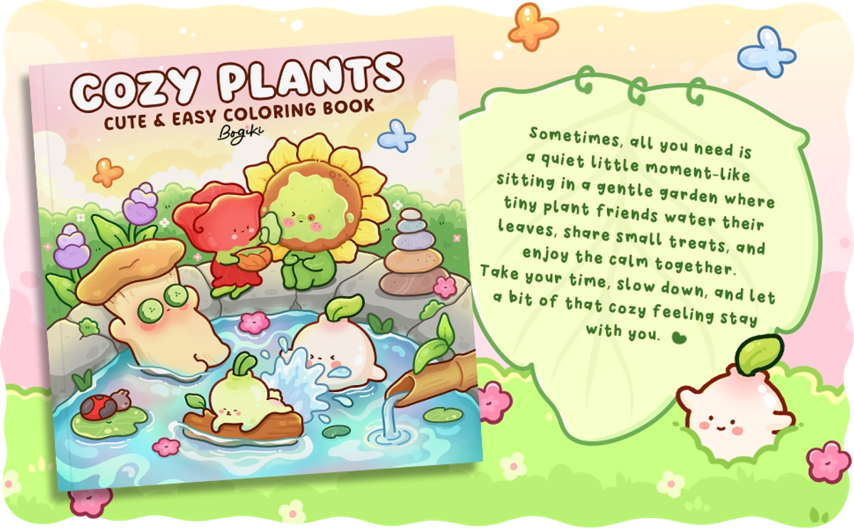 A peaceful garden is waiting for you to bring it to life with color. Inside this coloring book, you’ll discover delightful pages filled with adorable flowers, mushrooms, plant friends, and cute animals in cozy nature scenes. Follow their little adventures as they water plants, share snacks, relax under leaves, explore hidden corners, and enjoy gentle days side by side.