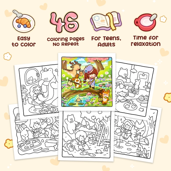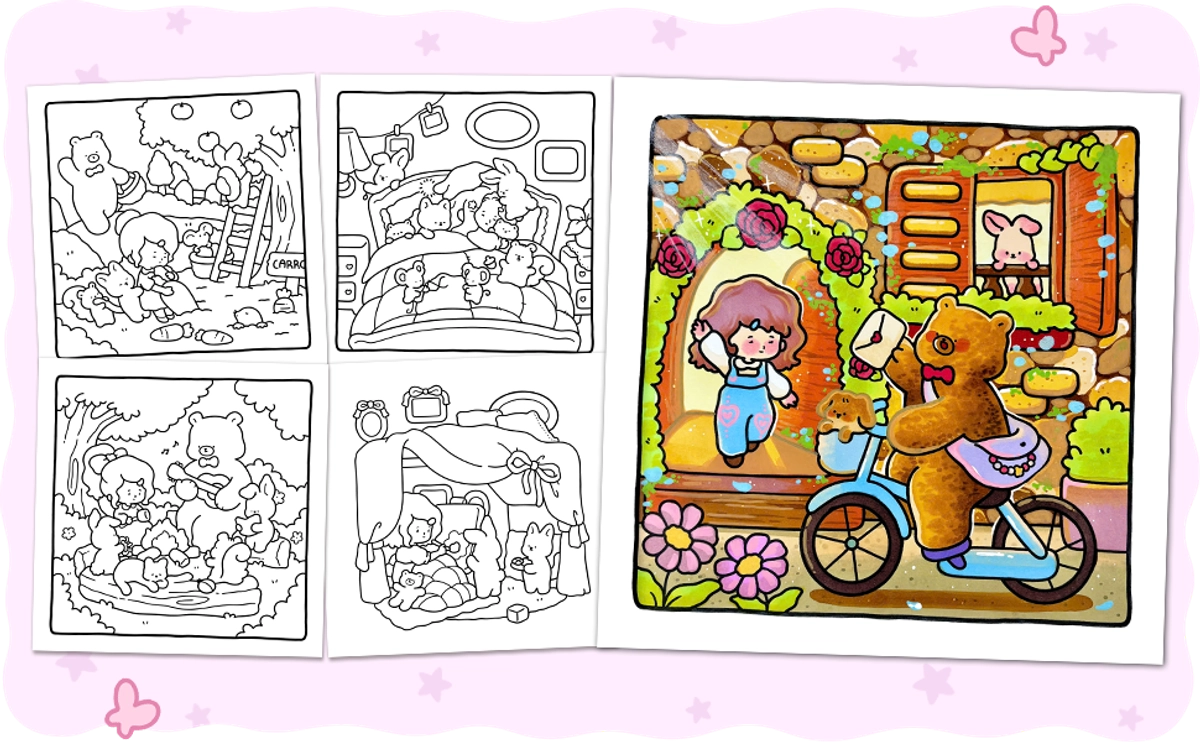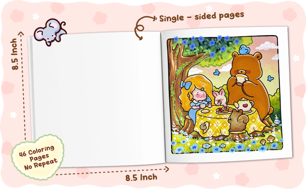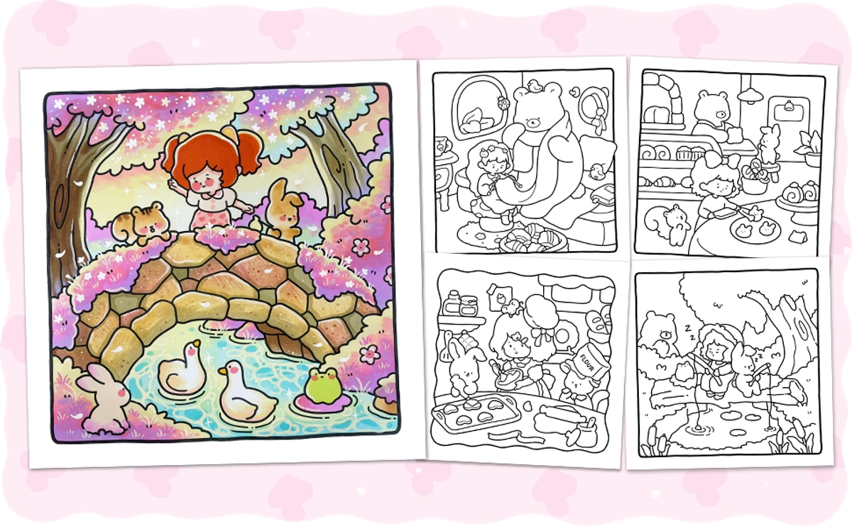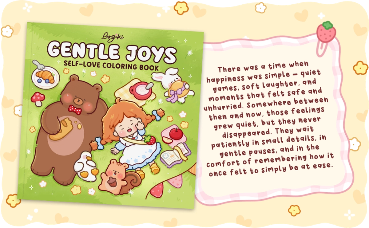 Gentle Joys is a calming collection of soft, cozy scenes filled with comfort and quiet joy. Inside, you’ll meet a cute girl and their fuzzy animal friends sharing peaceful moments that gently reconnect you with your inner child. Each page invites you to slow down, breathe, and relax through coloring.
