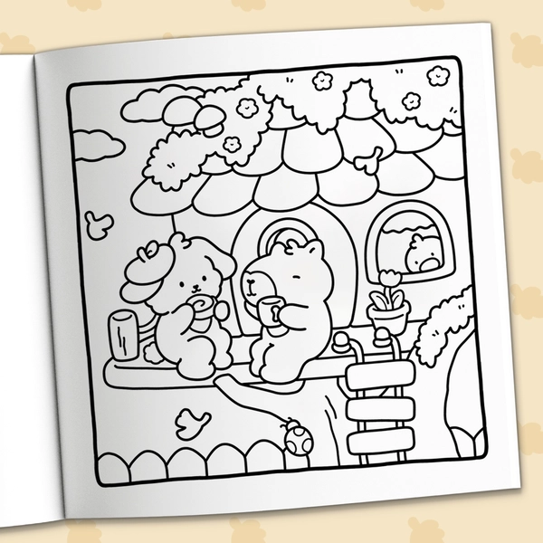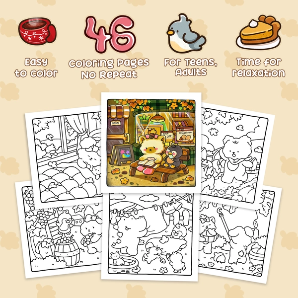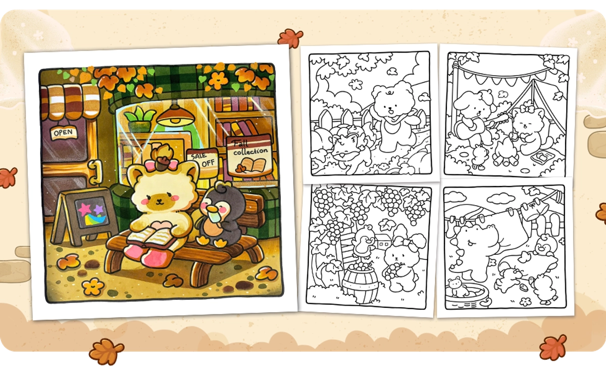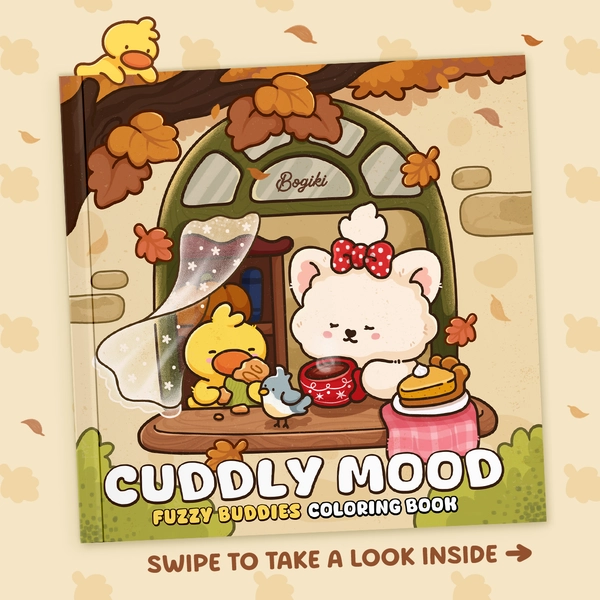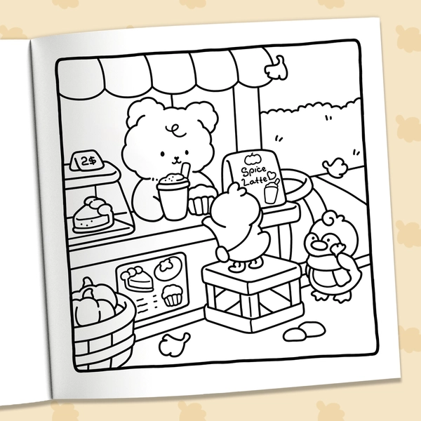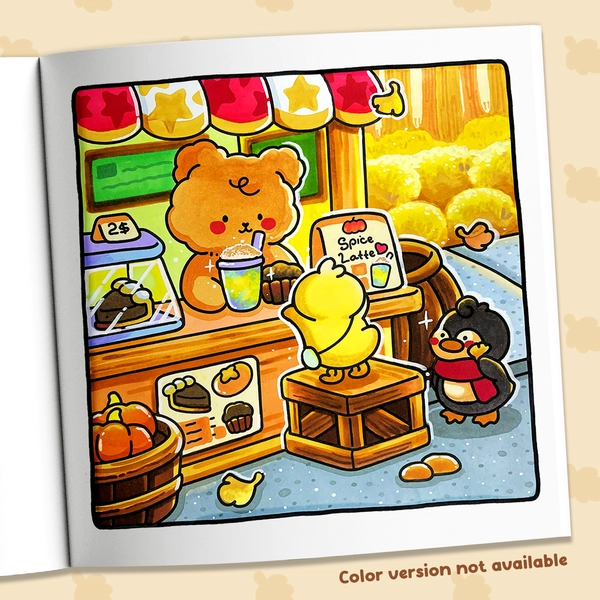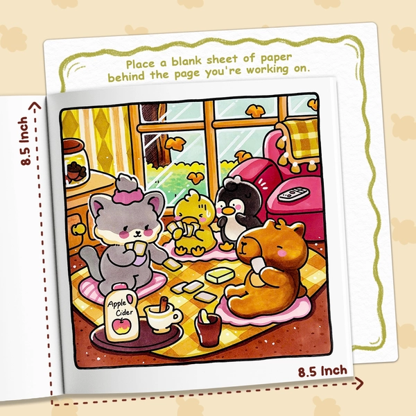 In the Cuddly Mood coloring book, you'll find adorable animal friends enjoying the gentle days of fall. Each page depicts warm scenes like cooking, playing with friends, or simply savoring a cup of tea. These cozy illustrations highlight the little joys of autumn and give you plenty of easy, relaxing pages to color.