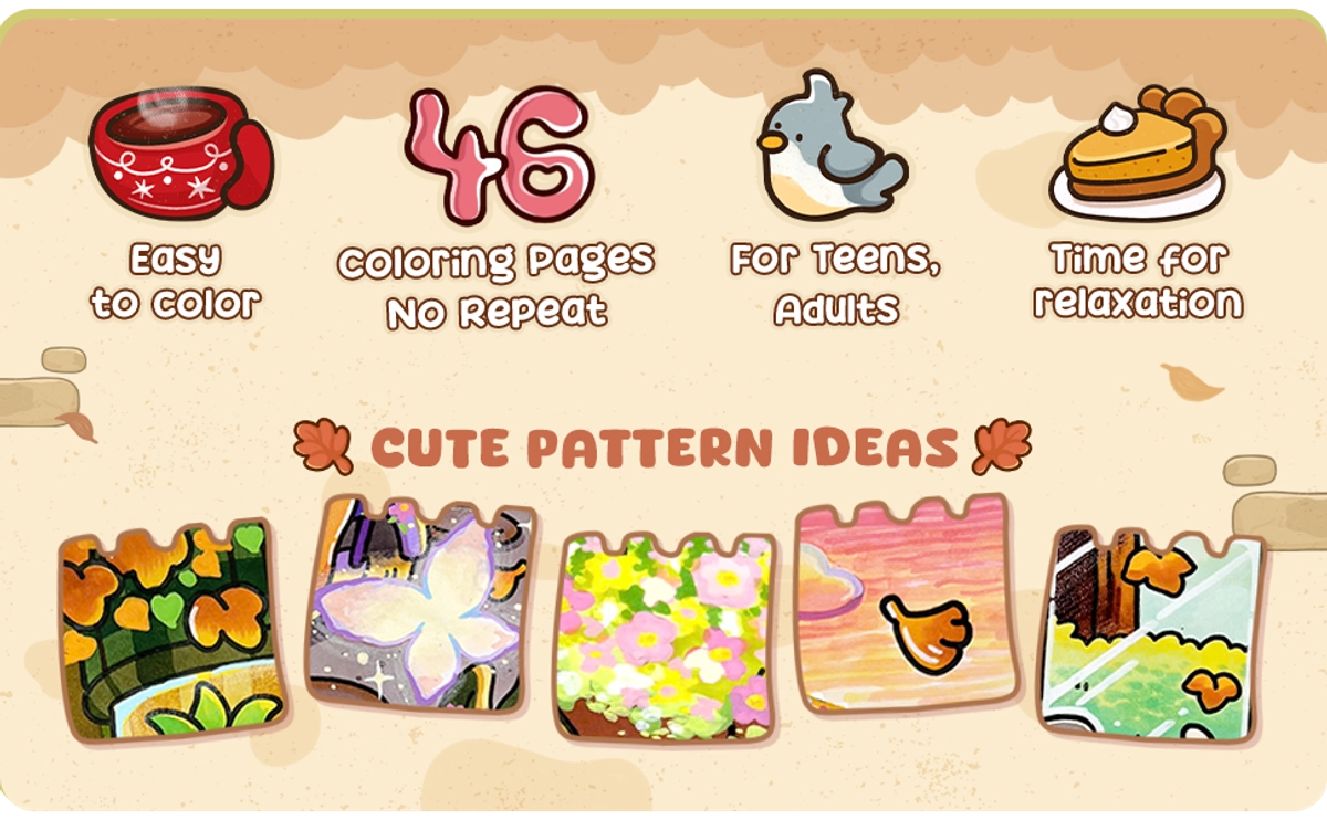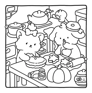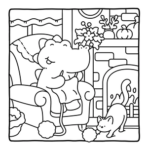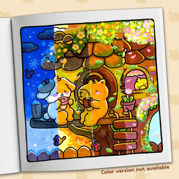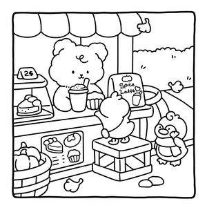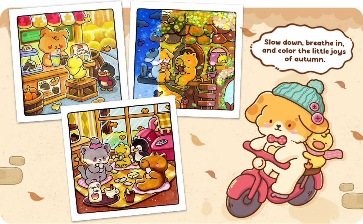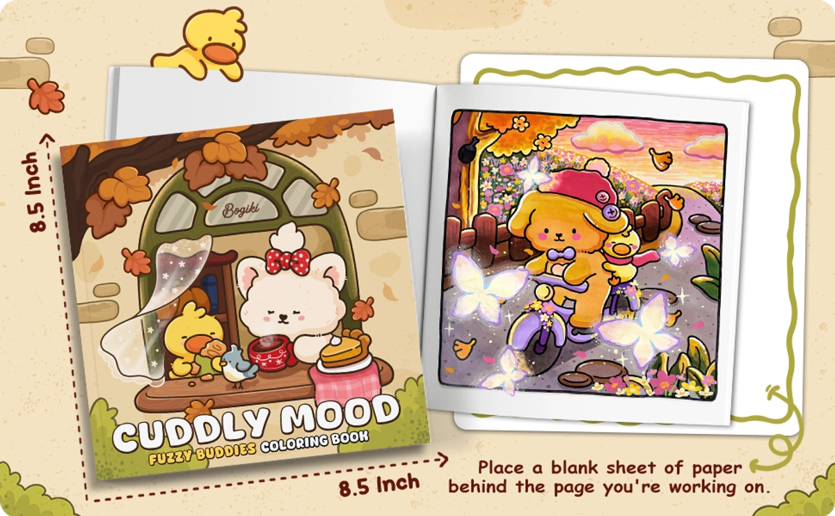 In the Cuddly Mood coloring book, you'll find adorable animal friends enjoying the gentle days of fall. Each page depicts warm scenes like cooking, playing with friends, or simply savoring a cup of tea. These cozy illustrations highlight the little joys of autumn and give you plenty of easy, relaxing pages to color.
