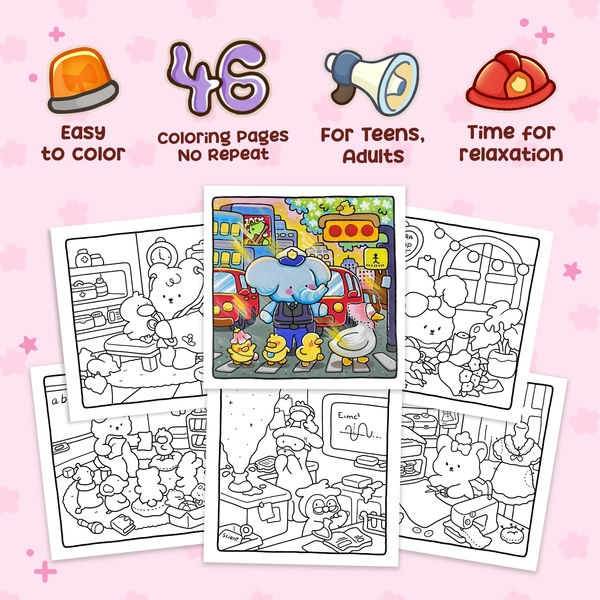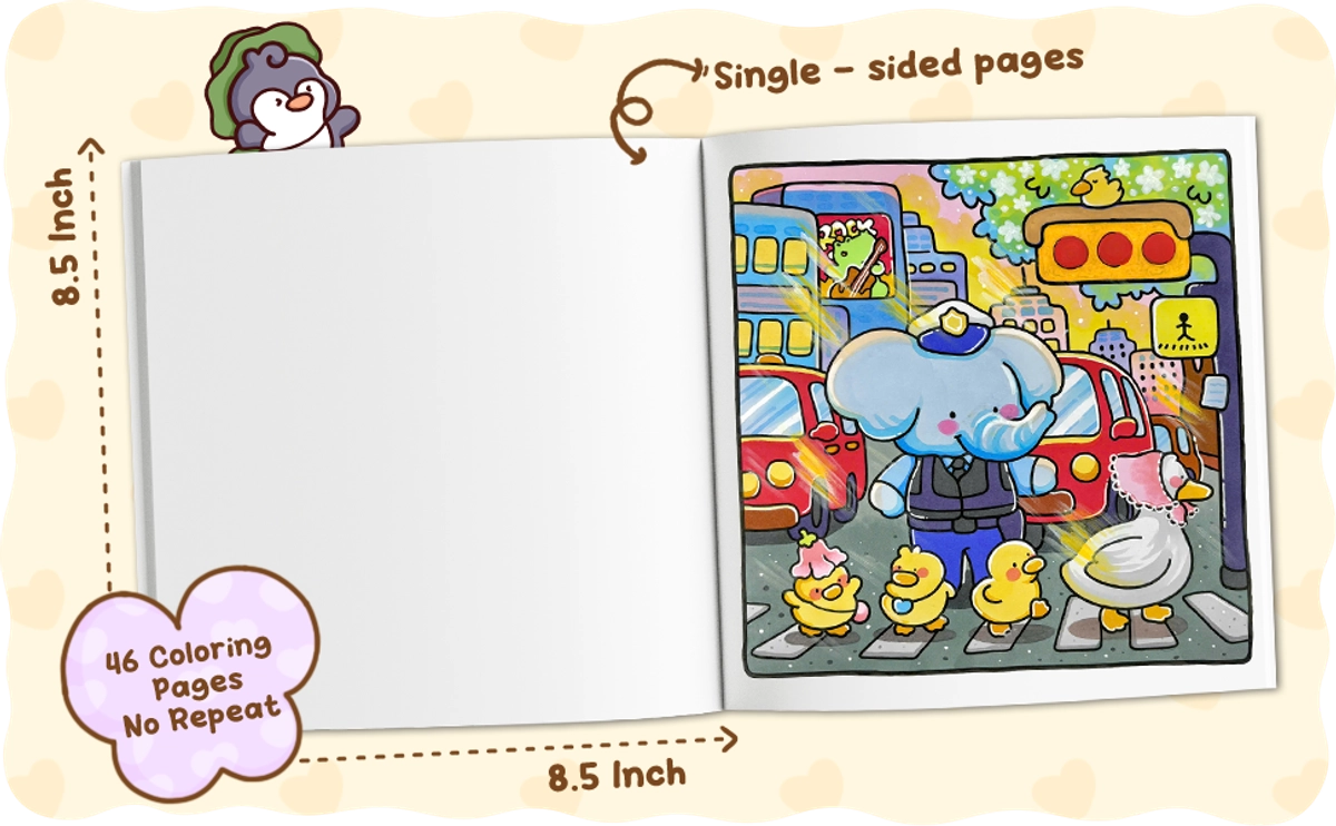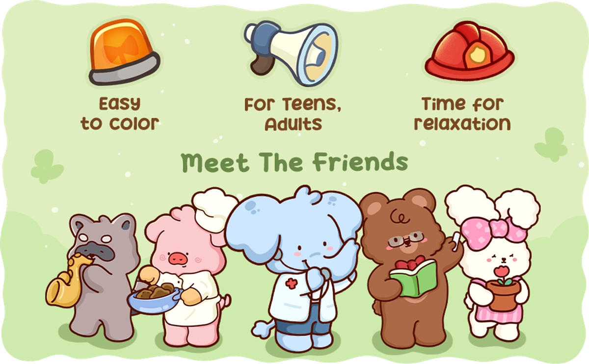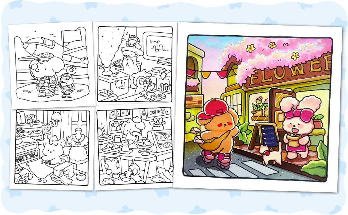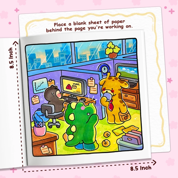 This cozy coloring book shows you a busy workday of adorable animal friends. From office workers handling their tasks, to doctors and nurses caring for patients, and singers sharing their songs on stage, each animal brings heart to what they do, showing how much they enjoy their job. This book helps you slow down, smile, and enjoy your coloring time.