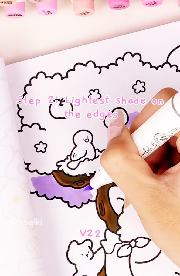 Next, move to the foliage area. Use the light purple marker (V22) to lay down a soft base layer beneath the tree canopy. This gentle tone sets the mood for a dreamy, romantic wisteria and helps later layers blend smoothly.