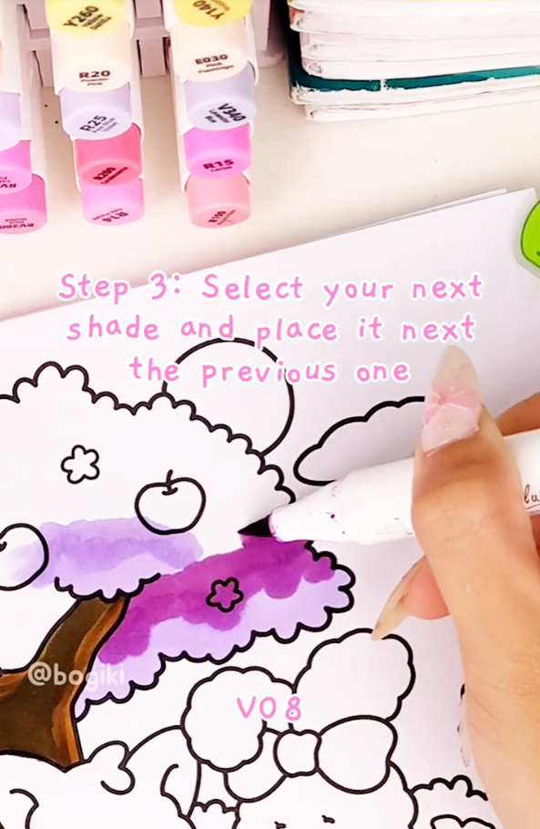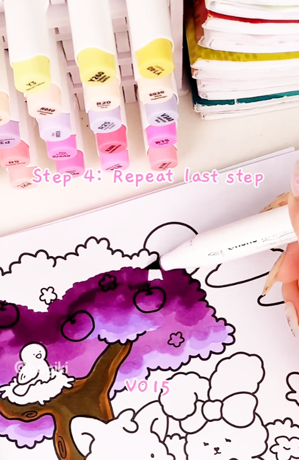 Now, gradually introduce a slightly darker purple (V08) and blend it upward over the base layer. Work slowly, letting the colors melt into each other. This transition creates the illusion of volume and depth within the tree canopy. Smooth blending is key here. By gently layering color, your wisteria tree drawing begins to feel soft and dimensional rather than flat.