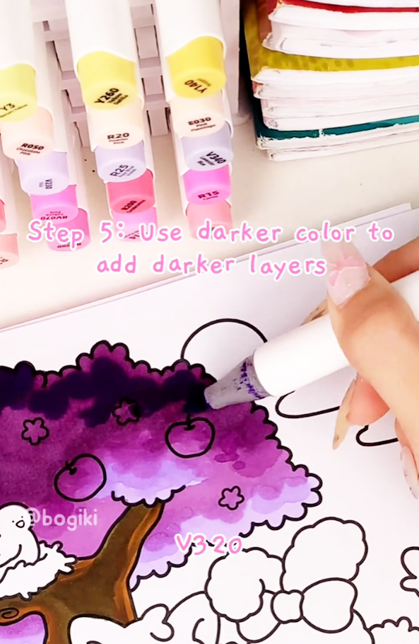 Use (V320), a dark purple marker, to create deeper shadows within the foliage. Focus on areas where leaves overlap or where light would naturally be blocked.
