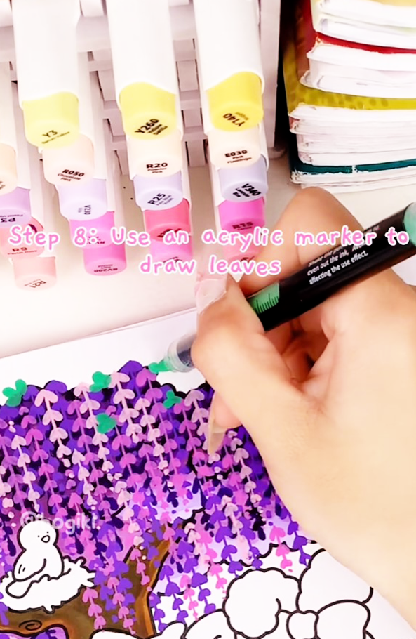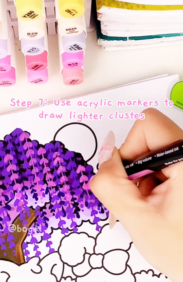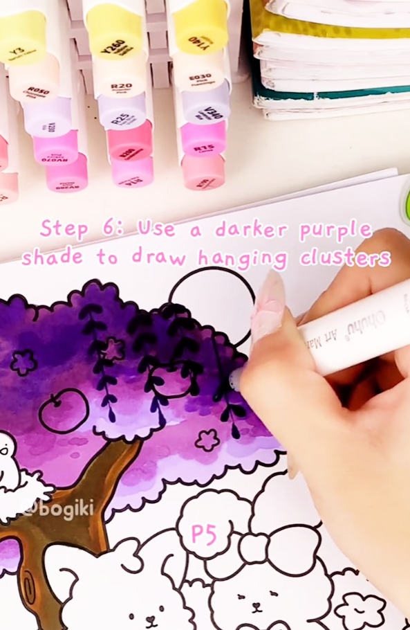 Now comes the most magical part—drawing the hanging wisteria flowers. Use the purple marker (P5) to sketch soft, flowing strands cascading downward from the branches.
