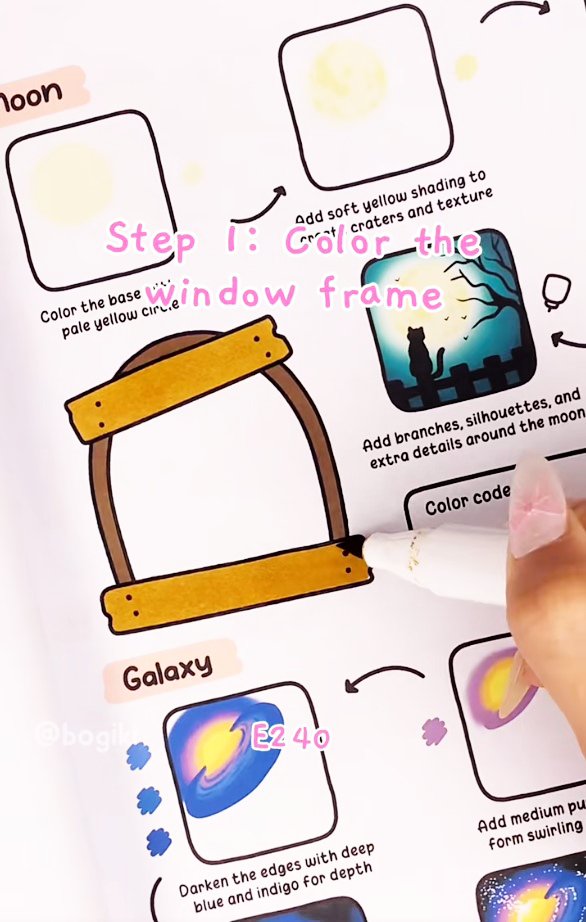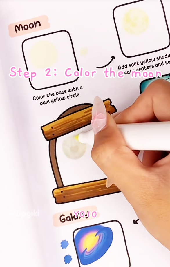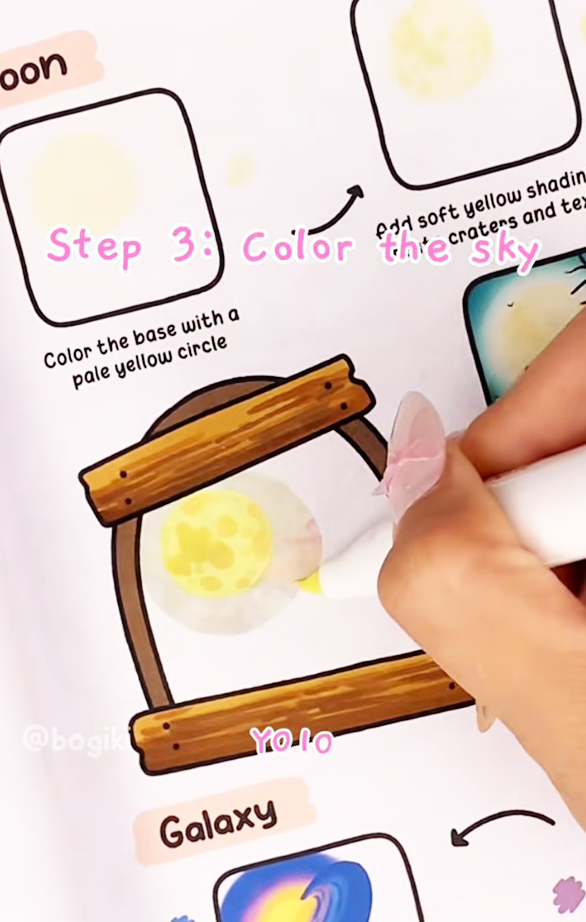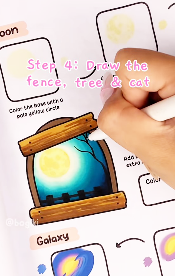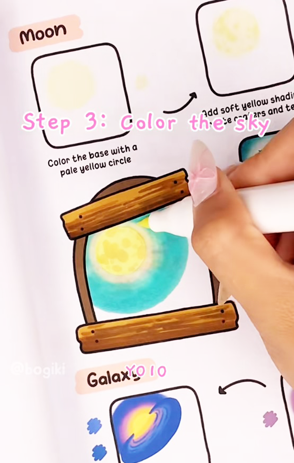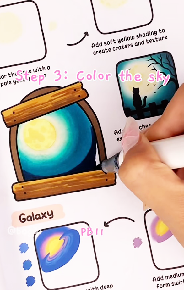 By blending these shades gently, you achieve a natural, moon-beautiful night sky effect, where the warm glow of the moon contrasts softly with the darker tones of the night sky. Light losing or feathering techniques can make the moon appear more realistic and inviting, giving your artwork that cozy, dreamy feel typical of Bogiki style.